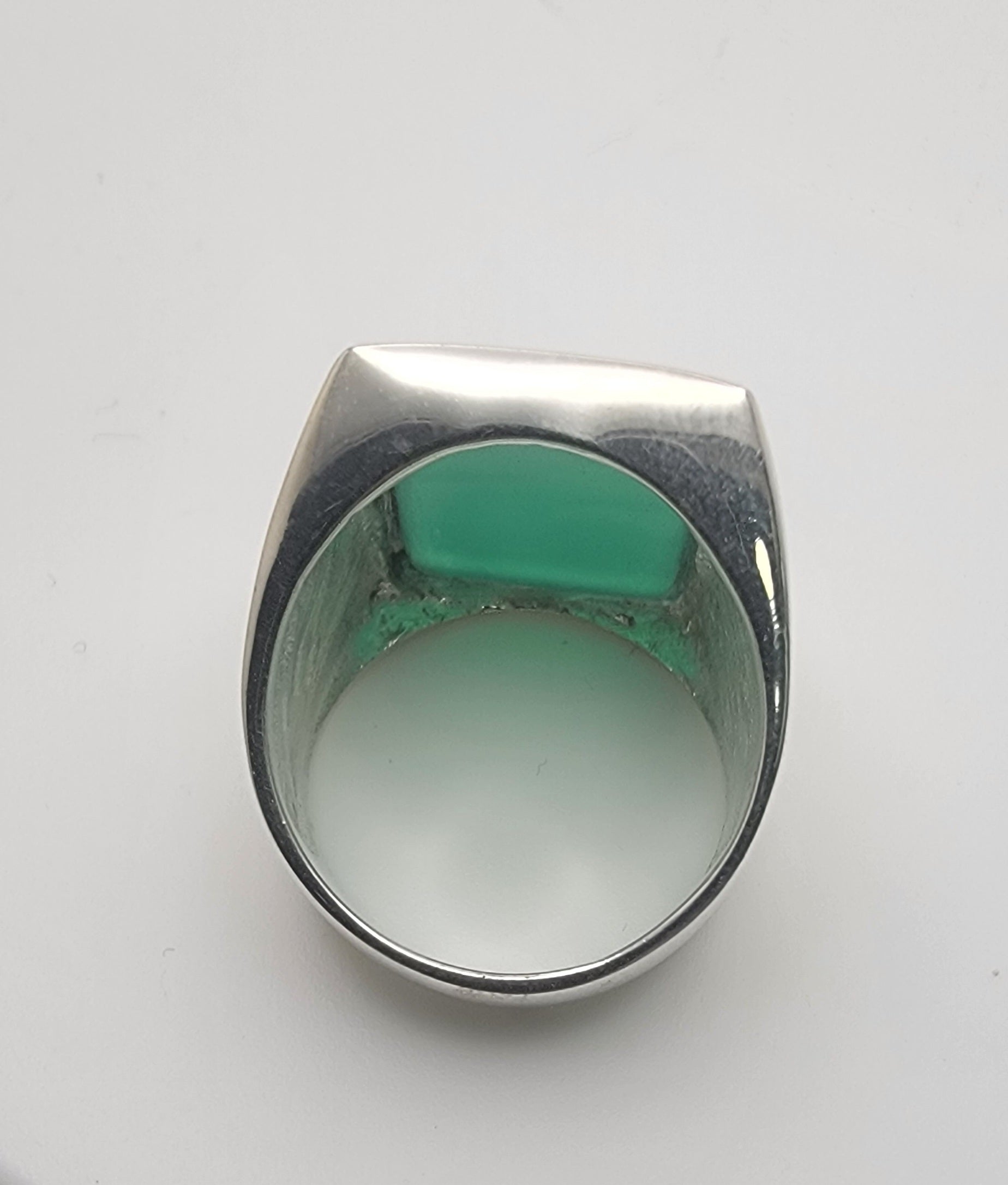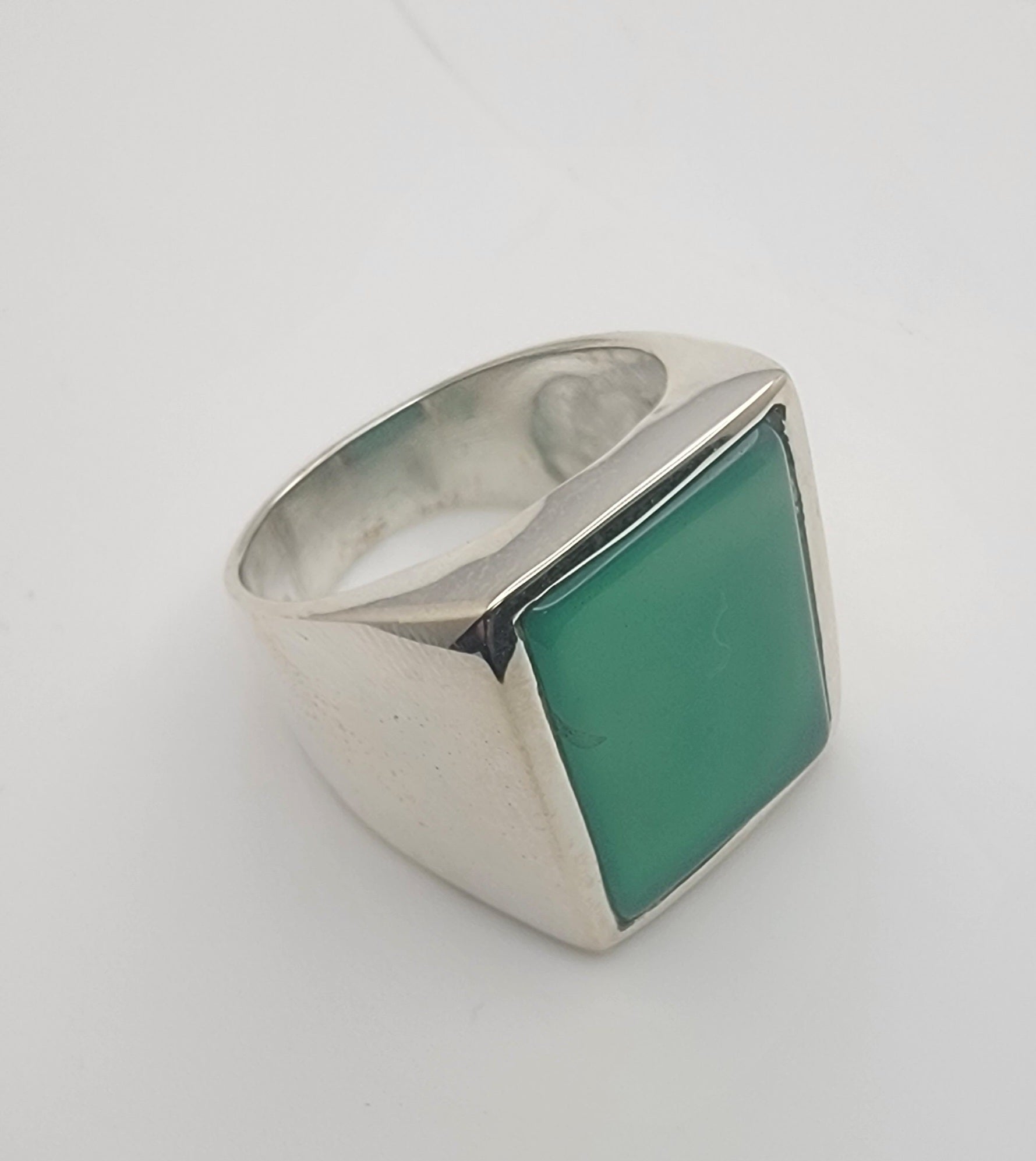 Bold, sleek, and effortlessly modern—this sterling silver ring features a polished rectangle-cut green chalcedony set in a substantial, tapered band. The stone’s cool, vibrant hue brings a sense of calm and clarity, while the clean lines give it a contemporary edge. Known as a stone of harmony and compassion, green chalcedony is believed to promote emotional balance, reduce stress, and open the heart to kindness and connection. Whether worn as a statement piece or everyday staple, this ring offers timeless style with a refreshing pop of color.