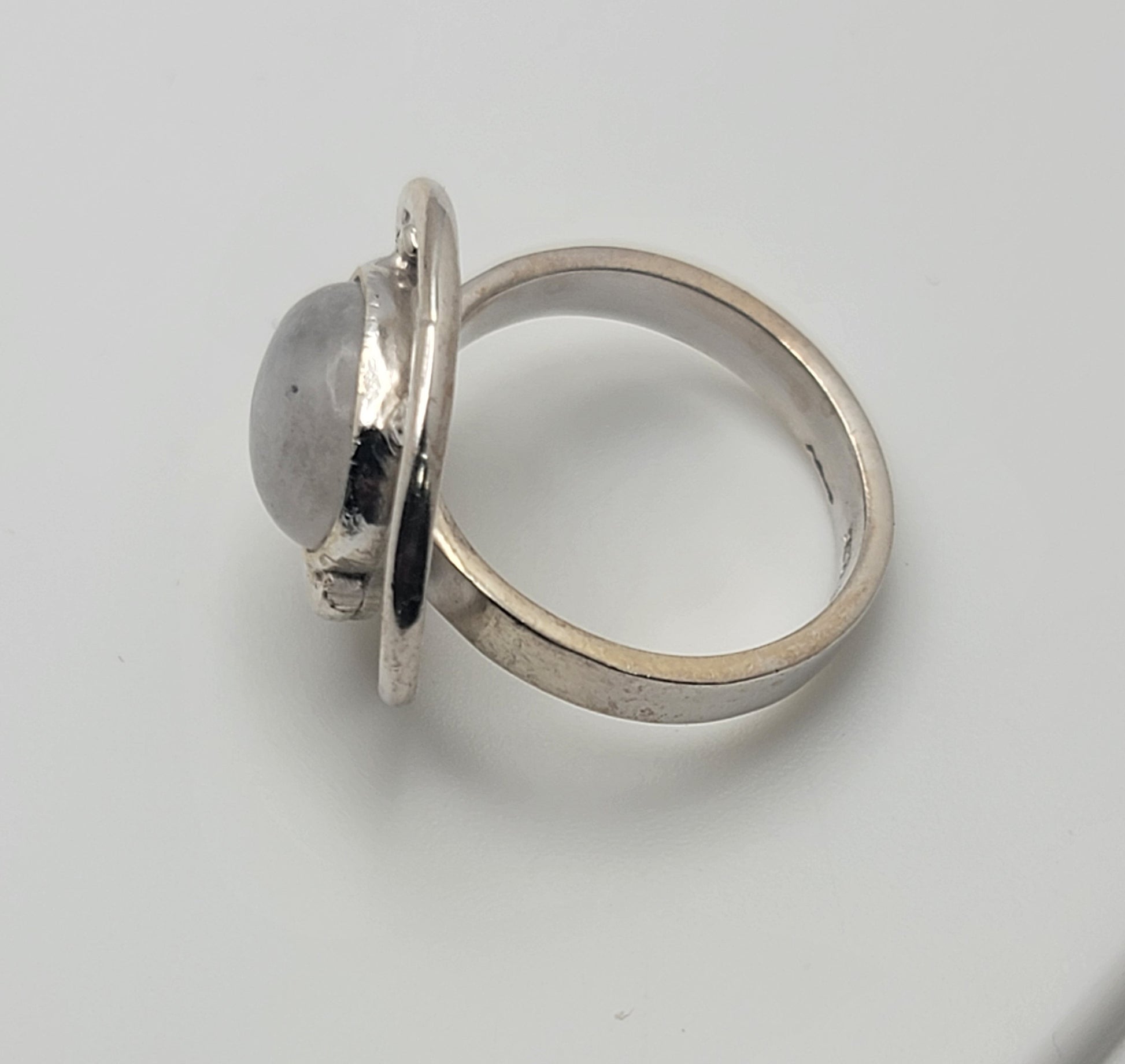 This handcrafted ring features a luminous moonstone with a soft blue flash, set in a modern open-frame sterling silver design that highlights its natural glow.