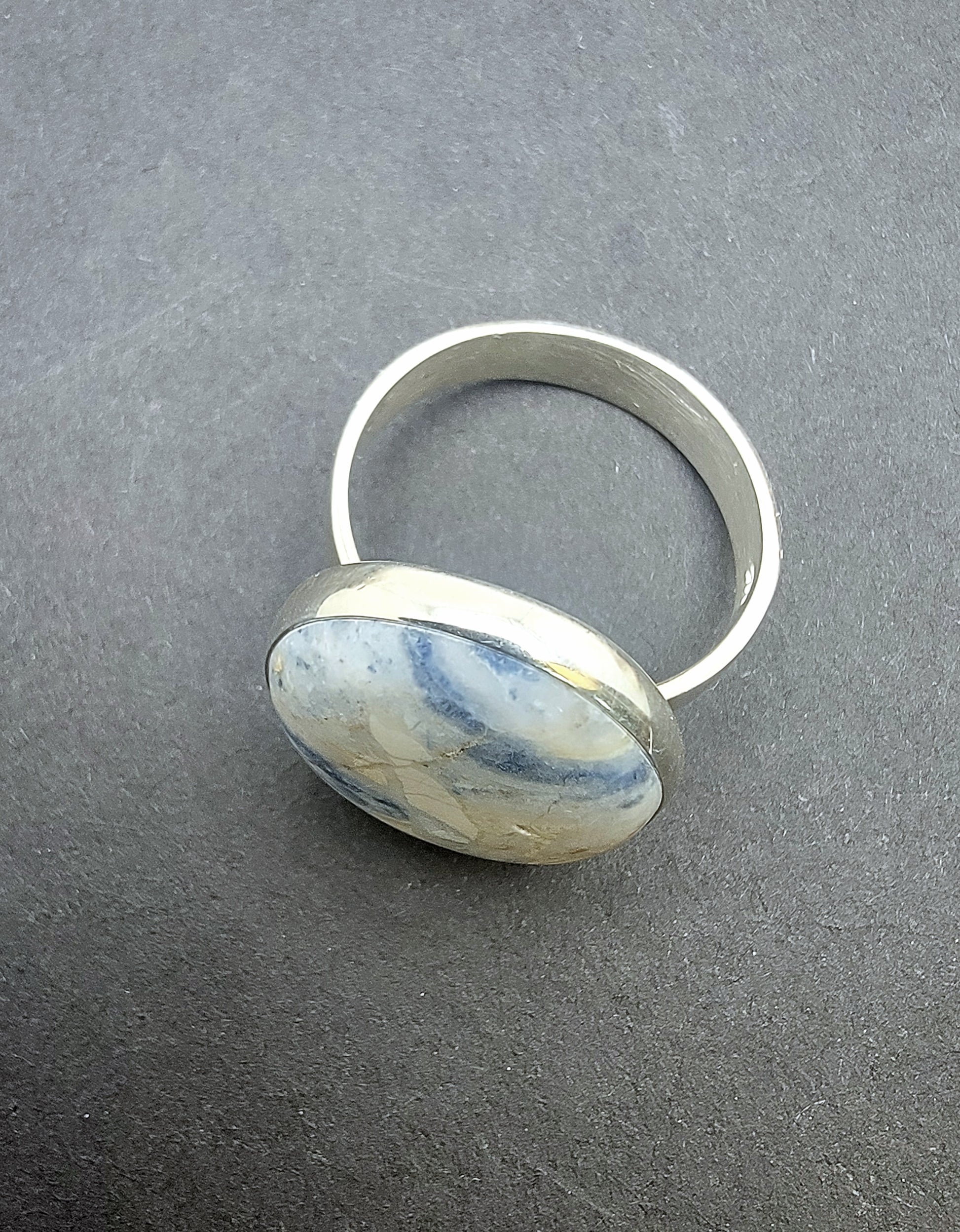 Illuminate your collection with this bold sterling silver ring, featuring an 18 mm natural scheelite cabochon set in a smooth bezel. The 4 mm-wide band balances strength and comfort, making it perfect as a signature piece or stacked with more delicate bands. Scheelite’s soft ivory tone with subtle gold flecks catches the light beautifully—wear it anytime you need a touch of quiet luxury.